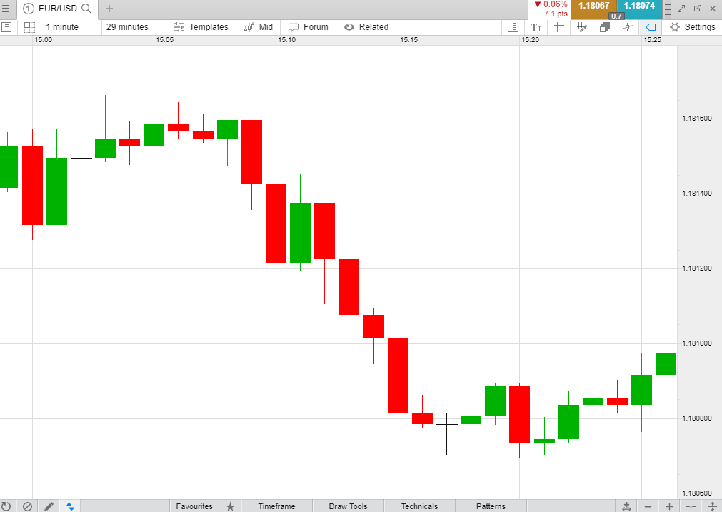 The below chart shows the currency pair EUR/USD, which is commonly used for forex scalping, given that the forex market is highly liquid. Each candlestick represents a one-minute interval between prices. As you can interpret from the chart, the price has only moved approximately eight pips (percentages in point) over a time period of 15 minutes, meaning that the currency pair is relatively stable and there are no large price fluctuations.